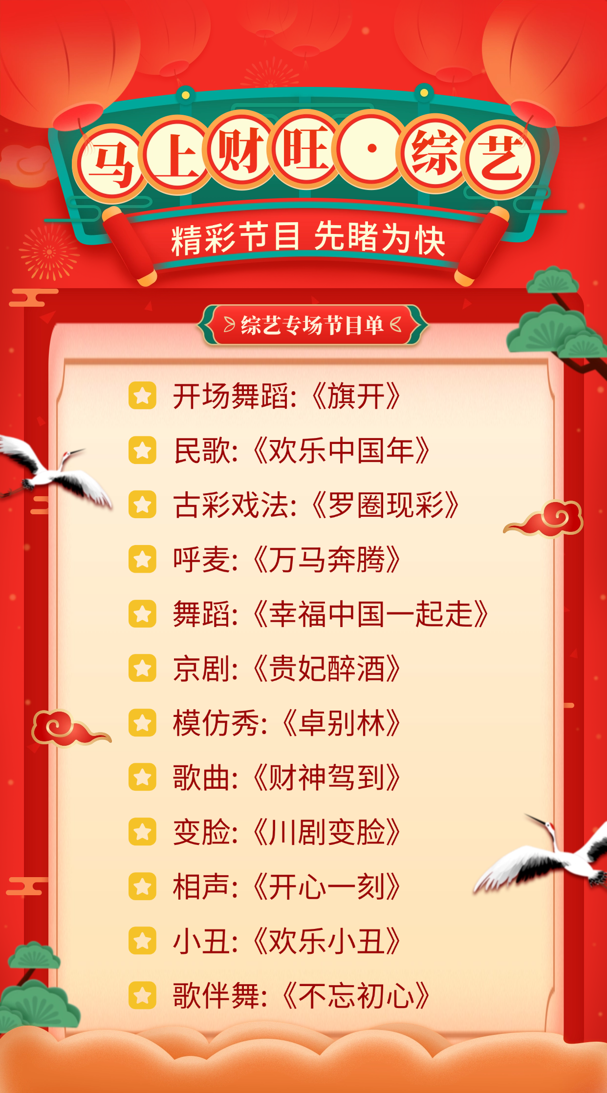 开场舞《旗开》气势恢宏,民歌《欢乐中国年》唱响新春喜悦;古彩戏法《罗圈现彩》、川剧变脸带来奇幻惊喜,呼麦《万马奔腾》尽显豪迈气势;京剧《贵妃醉酒》演绎国粹雅韵,模仿秀、相声与小丑表演妙趣横生,最终在歌伴舞《不忘初心》的旋律中传递美好期许。整台演出精彩纷呈,邀您共赴视听盛宴,喜迎马年新春。