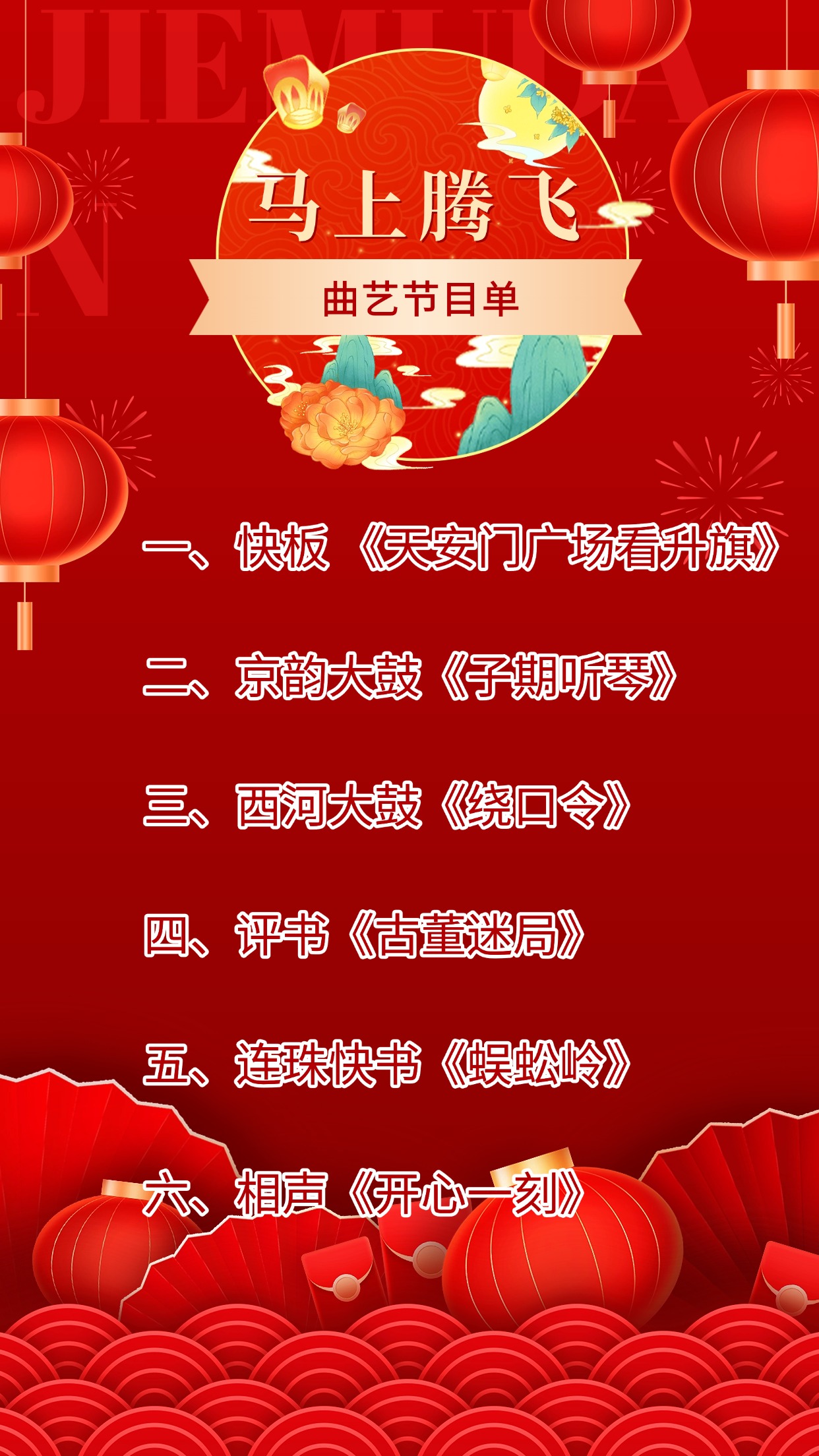 从快板《天安门广场看升旗》的激昂抒怀,到京韵大鼓《子期听琴》的雅致古韵;从西河大鼓《绕口令》的巧思妙语,到评书《古董迷局》的悬念迭起,连珠快书《蜈蚣岭》尽显功底,相声《开心一刻》更添满堂欢笑。地道京腔演绎家国情怀与市井趣味,邀您共赏非遗魅力,品味传统曲艺的独特韵味。