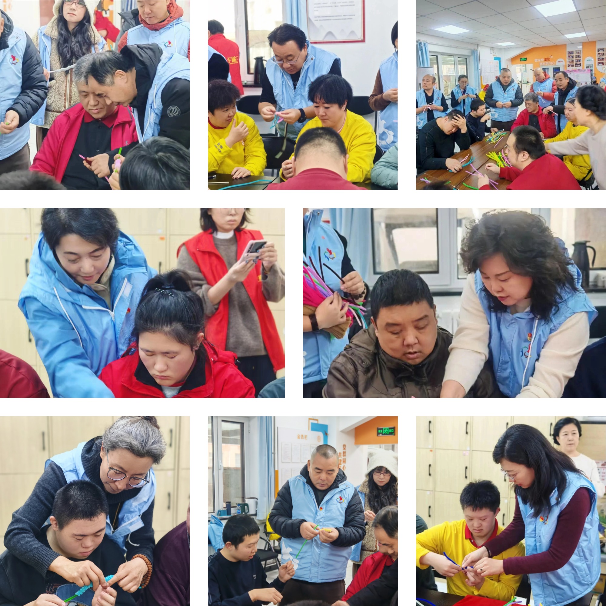 文艺表演后,“巧手传温情 爱心献给党”毛根手工制作互动温情开启,党员志愿者耐心陪伴、细致指导,与残障朋友们一同制作手工作品,过程中亲切交谈、送上祝福,现场欢声笑语不断,暖意融融。